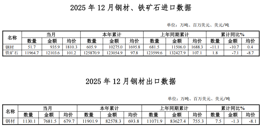 2025年12月,我國(guó)出口鋼材1130.1萬噸,環(huán)比增加132.1萬噸、增幅13.2%;均價(jià)679.7美元/噸,環(huán)比下跌16.3美元/噸、跌幅2.3%。1-12月累計(jì)出口鋼材11901.9萬噸,同比增加830.0萬噸、增幅7.5%。